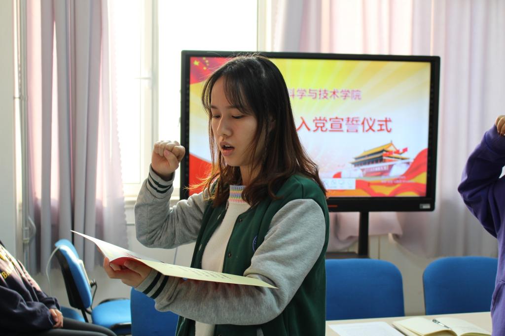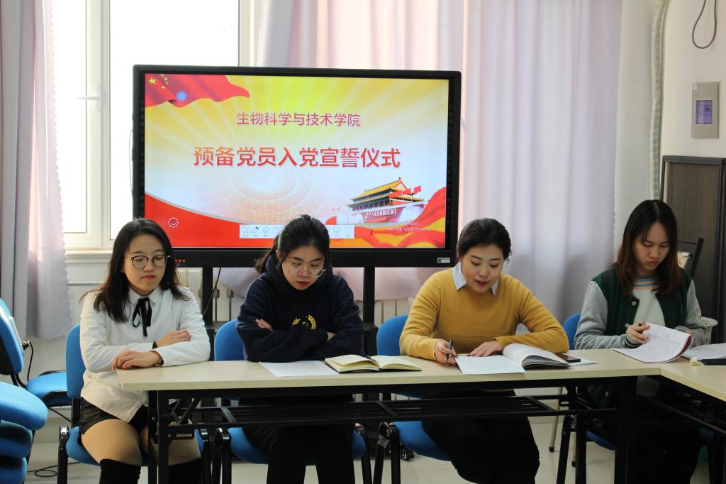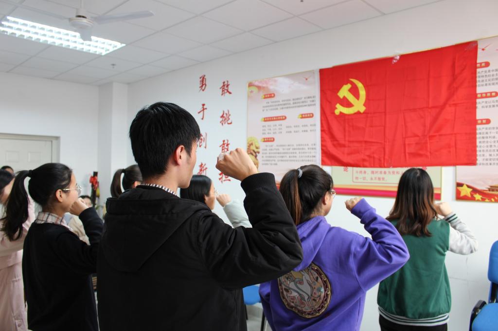 宣誓仪式在庄重雄浑的《国际歌》中开始,学生党支部书记江丰沛老师宣读了预备党员名单。接着,在组织委员聂润洁的带领下,6名预备党员面向党旗,手握成拳举过肩头,逐句的庄严宣誓。“我志愿加入中国共产党,拥护党的纲领,遵守党的章程,履行党员义务……”字里行间可见预备党员服务于党的决心。