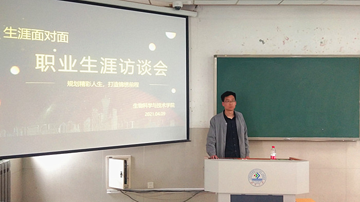 规划精彩人生,打造锦绣前程。为增加学生对生物制药就业方面的了解,4月11日下午,米兰milan官方网站在10J306举办职业生涯访谈会活动,邀请邦恩泰生物集团研发总裁刘磊教授来校宣讲。活动由学院辅导员阮斌主持,部分本科学生参加了此次活动。
