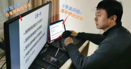 如果家里有一台笔记本电脑和一个暂时不用的显示器,连接后设置成双屏,就能把一台电脑的画面扩展显示在两个屏幕上,1号显示器用于浏览学生的讨论,或者打开教师的个人备用文档,2号显示器用于播放课件分享给学生观看。这样一来,老师的视野就会更加开阔,不必来回切换窗口,可以气定神闲做“主播”了。