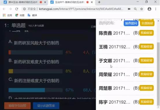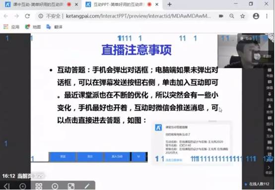 王老师说,直播教学时,学生由于长时间观看PPT课件讲解,会感觉到疲倦,因此,适时使用课堂派与学生做互动非常有必要,既调节了上课节奏,又及时了解到学生的掌握程度。另外,老师还可以根据需要把课件之外的窗口拖拽到2号显示器中共享给学生,比如,摄像头窗口,让学生看到老师的脸,也可以调节学生的学习情绪。