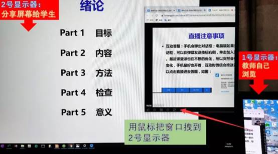1. 双屏直播时,学生看不到1号显示器的画面,就可以专心观看PPT讲解,不受教师电脑里其它软件的干扰;老师在直播时,可以随时关注1号显示器中QQ群或讨论区里的留言,一旦有共性问题,可以随时将窗口拖进2号显示器里,与学生交流互动。