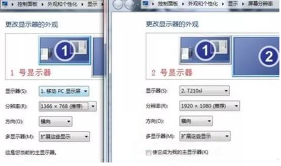 设置扩展显示。在显示器属性中采用“扩展这些显示”,笔记本电脑屏幕为屏幕1,并设置为“主显示器”,外接的显示器设置为屏幕2