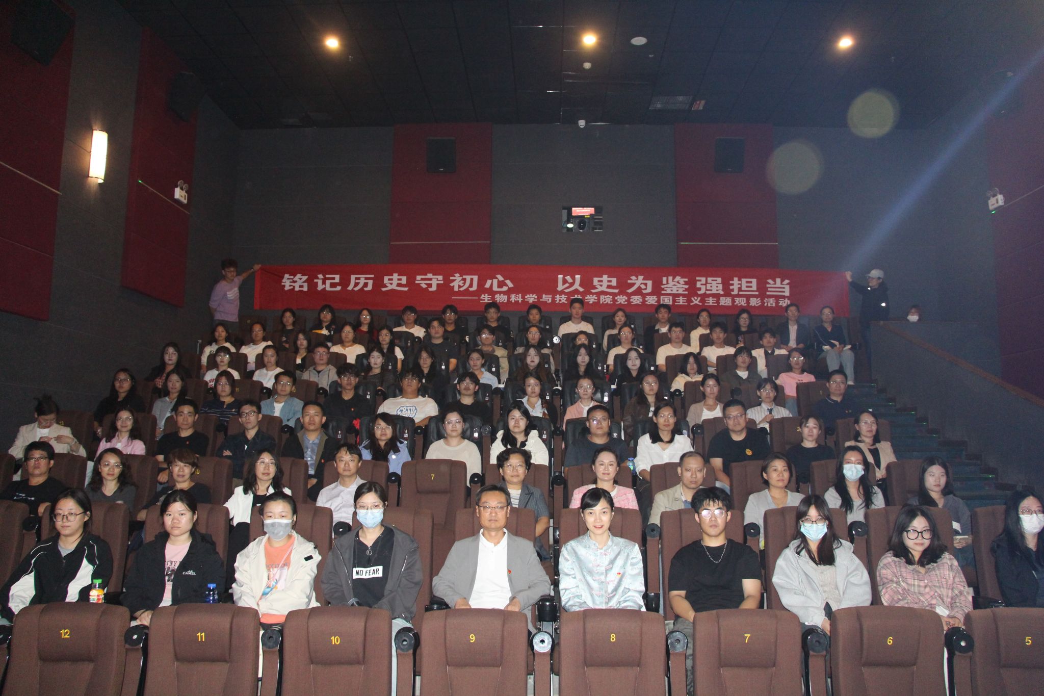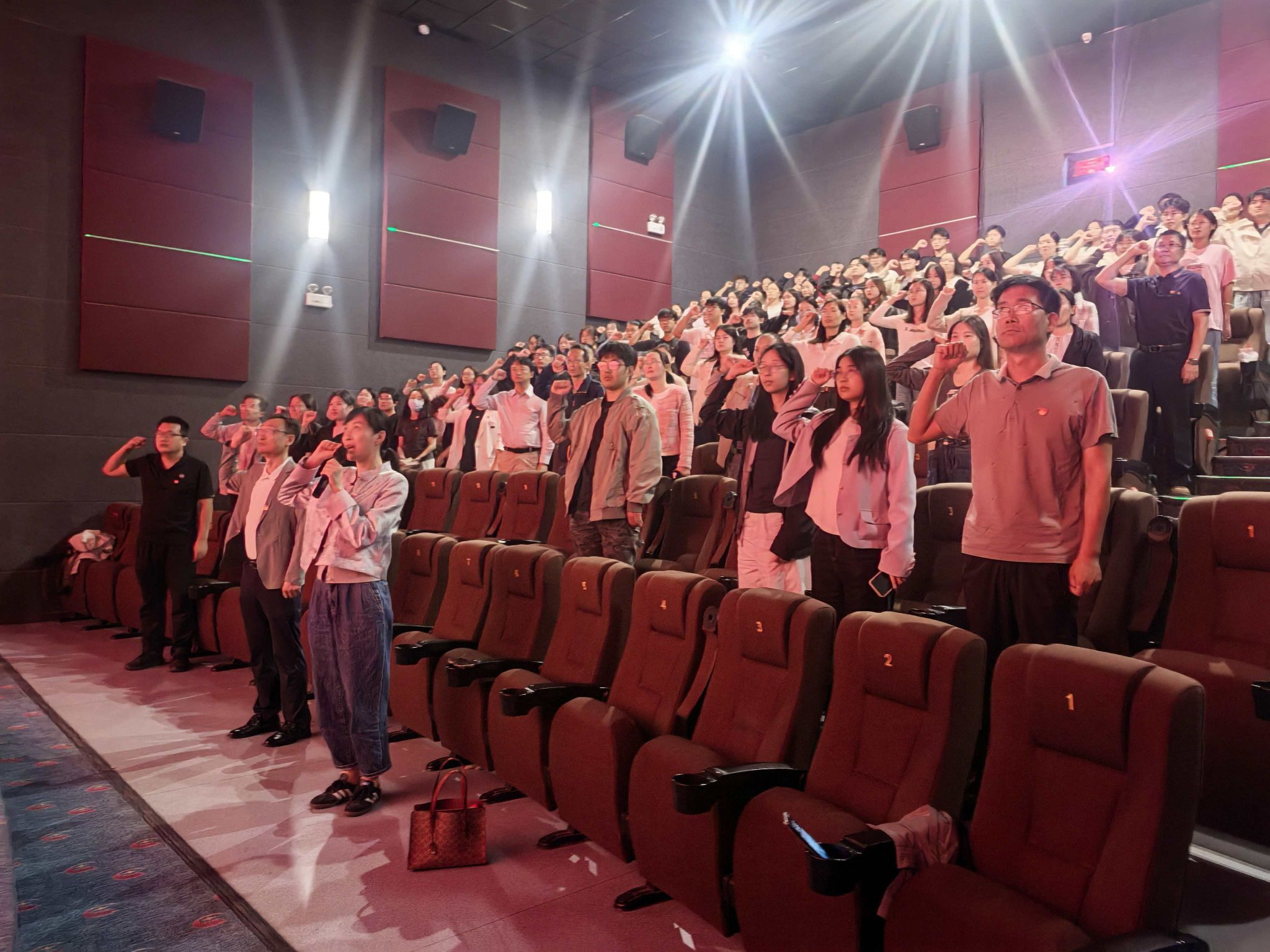 最后,全体党员面向党旗重温入党誓词,铿锵有力的誓言回荡在影厅中,彰显了新时代党员“以史为鉴、强国有我”的坚定信念。