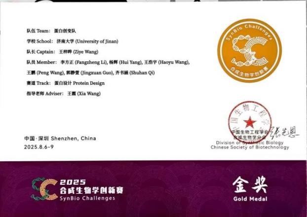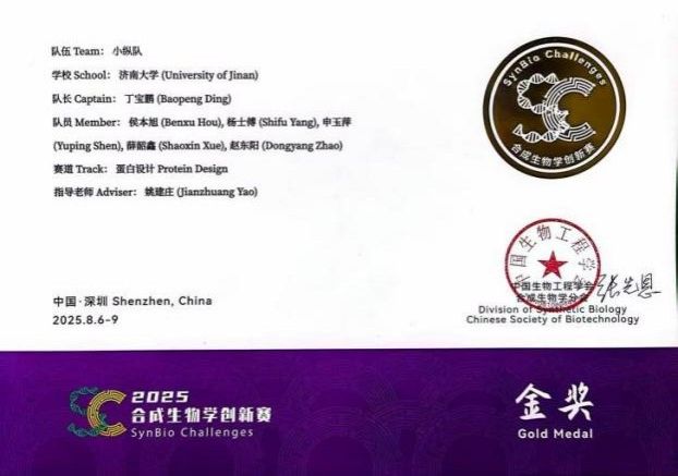 学院组建了两个学生团队参加本次大赛的蛋白设计赛道(分别是:小纵队,成员为丁宝鹏、杨士博、申玉萍、侯本旭、赵东阳、薛韶鑫;蛋白创变队,成员为王梓晔、杨辉、齐书涵、郭静萱、王鹏、王浩宇、李方正)。凭借扎实的专业知识、卓越的创新思维和不懈的努力,两个团队在众多参赛队伍中脱颖而出,双双荣获金奖!这一成绩不仅是对学院参赛团队的高度认可,更彰显了学院在合成生物学领域的教学与科研实力。